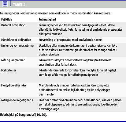 I litteraturen har der været stor fokus på de problemer, som kan elimineres efter implementering af EPM. Der er ikke nogen tvivl om, at EPM vil kunne medvirke til at reducere antallet af eksisterende fejlmuligheder. Med et fuldt integreret EPM-system og øjeblikkelig adgang til tidstro medicinske data, kan fejlbeslutninger, som opstår som følge af mangel på information, reduceres signifikant [4]. Medicinordinationen registreres udelukkende ét sted, og det giver sundhedspersonalet et samlet og opdateret overblik over patienten [6, 7]. Tabel 2 viser et udpluk af typiske fejlmuligheder, som kan opstå ved manuel medicinordination, altså dem som man kan forvente reduceret med indførelsen af EPM. Der har været mindre opmærksomhed på, at EPM i sig selv kan rumme potentiale til, at nye fejl opstår [2, 4, 12]. Nærværende artikel sætter fokus på, om EPM i sig selv kan medføre nye fejl.