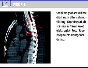 Summary Medistinal abscess caused by self-mutilation of the hypopharynx Ugeskr Læger 2010;172(21):1609-1610 A 44-year-old male with a non-specific psychological disturbance was diagnosed with septicemia. The patient had unsuccessfully tried to remove what he believed to be a fish bone from his throat. Computed tomography revealed a descending abscess in the mediastinum along with perforations in the pharynx and oesophagus to the mediastinum. He was treated with antibiotics and drainage of the abscess and discharged after six weeks without sequelae. Sharp foreign bodies in the pharynx should be removed professionally to avoid perforation and thus mediastinitis.