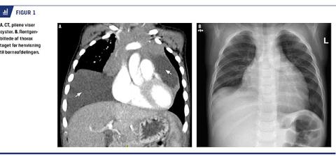 En røntgenoptagelse af thorax gav mistanke om et stort hjerte, der fyldte det meste af venstre thoraxhalvdel. Elektrokardiogrammet var normalt for patientens alder. En efterfølgende transtorakal ekkokardiografi viste en cystisk masse i den højre kardiofreniske vinkel med nær relation til perikardiet, hvilket dislokerede hjertet. En CT af thorax viste to store cyster indeholdende talrige septae i mediastinum (Figur 1). Den ene cyste (10,3 × 2,4 cm) displacerede thymus og omgav perikardiet. Den anden cyste (13,6 × 9,2 cm) strakte sig ind i højre hemithorax og komprimerede trachea i niveau med carina trachea. De tentative diagnoser efter CT var perikardiecyste, thymuscyste eller lymfangiom.