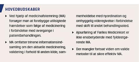 MA skal ikke forveksles med medicingennemgang, hvor der typisk foretages en kritisk og systematisk stillingtagen til patientens samlede medicinering. I denne artikel vil vi give et overblik over forskningslitteraturen om MA og gøre status over håndtering af MA i Danmark.