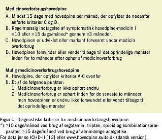 Medicinoverforbrugshovedpine (MOH) er kendetegnet ved kronisk hovedpine (≥15 dage/måned) og samtidig daglig eller næsten daglig indtagelse af symptomatisk hovedpinemedicin. Karakteristisk er der tale om patienter, som i forvejen har en primær hovedpine, der over år optræder med øget anfaldsfrekvens og samtidig accelererende medicinindtag for sluttelig at ende i en kronificeret tilstand, der er refraktær for både medicinsk og ikkemedicinsk behandling. Fænomenet er således ikke beskrevet hos patienter med dagligt analgetikaindtag på anden indikation end hovedpine, f.eks. reumatoid artritis eller rygsmerter [1, 2]. Det er en hovedpineform, der udgør et voksende problem i verden, inklusive Danmark, og som har store menneskelige og samfundsmæssige omkostninger [3-7]. MOH blev for første gang beskrevet i 1951 af Peters & Horton fra Mayo Clinic i Minnesota, USA [8]. Siden har den været beskrevet under forskellige navne: rebound headache, drug-induced headache, medication-misuse headache og painkiller headache. I 1988 publicerede det internationale hovedpineselskab den første hovedpineklassifikation [9], hvormed man ved hjælp af operationelle diagnostiske kriterier kunne klassificere de forskellige hovedpineformer, inklusive MOH. I de mellemliggende år er det blevet klart, at de diagnostiske kriterier for MOH bør være mere specifikke, ligesom tilkomsten af de migrænespecifikke triptanpræparater har medført behov for revision. Det er således i dag veldokumenteret, at også triptanoverforbrug indebærer en risiko for, at der udvikles MOH [10-12]. Med den 2. udgave af klassifikationen fra 2004 foreligger der nu specifikke diagnostiske kriterier for de enkelte stofgrupper med angivelse af minimumsindtag og påkrævet hovedpinefrekvens og -karakteristika.