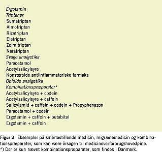 I anden udgave af den internationale hovedpineklassifikation fra 2004 [13] har de førende eksperter på dette område opstillet nye evidensbaserede diagnostiske kriterier for MOH (Figur 1). Diagnostisk inddeles MOH nu i klasser, afhængigt af hvilken type medicin der overforbruges: ergotamin, triptan, analgetika, opioid eller kombinationspræparater [13] (Figur 2). Fælles og afgørende er, at medicinoverforbruget finder sted jævnt fordelt over en måned, og ikke med excessivt indtag nogle enkelte dage. Ligeledes er det essentielt, at diagnosen først kan stilles efter medicinseponering, der skal medføre ophør af MOH, men oftest ikke af den primære hovedpine [13]. Derudover er der defineret to underafsnit, hvoraf det ene dækker hovedpine tilskrevet overforbrug af andre medikamenter end de tidligere nævnte, mens det andet er en samlediagnose kaldet »mulig medicinoverforbrugshovedpine«. Sidstnævnte anvendes som arbejdsdiagnose, mens medicinafvænningen pågår.