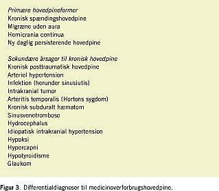Diagnosen MOH fastlægges via et grundigt interview og en grundig objektiv almen og neurologisk undersøgelse. Det er ofte nødvendigt, at patienten udfylder hovedpinedagbog gennem minimum en måned [17]. Differentialdiagnoser til MOH er først og fremmest kronisk spændingshovedpine og kronisk migræne, men sekundære årsager til hovedpine skal selvsagt udelukkes (Figur 3). For at stille diagnosen kræves det, at patienten har mindst 15 dage med hovedpine pr. måned gennem minimum tre måneder. For ergotamin, triptaner, opio-ider og kombinationspræparater gælder det, at frekvensen af medicinindtag skal være ≥10 dage pr. måned, mens det for svage analgetika gælder, at frekven sen skal være ≥15 dage pr. måned. Hovedpinen skal enten have udviklet sig under medicinoverforbruget, eller der skal have været en markant forværring af den oprindelige primære hovedpine. Desuden kræves der, at hovedpinen enten forsvinder eller vender tilbage til det oprindelige mønster inden for to måneder efter ophør af medicinoverforbruget. De diagnostiske kriterier indebærer således, at diagnosen MOH først kan stilles to måneder efter ophør af medicinoverforbruget.