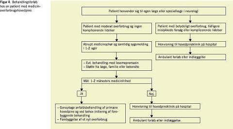 For at forebygge MOH er det nødvendigt med grundig information til alle hovedpinepatienter om risikoen ved hyppig medicinindtagelse. Det er vigtigt at være opmærksom på medicinindtagelsen hos alle hovedpinepatienter, brug af en hovedpinedagbog [17] såvel som faste øvre grænser for såvel håndkøbs som receptpligtig medicin anbefales. Hovedpinedagbogen kan fås ved henvendelse til Dansk Hovedpine Selskab (www.hovedpine.suite.dk). Et behandlingsforløb for en patient med medicinoverforbrugshovedpine er skitseret i Figur 4.