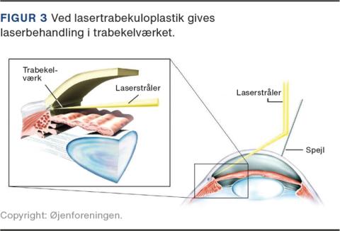 Behandlingen af åbenvinklet glaukom kan suppleres med selektiv lasertrabekuloplastik eller argonlasertrabekuloplastik (Figur 3). Lasertrabekuloplastik er i et nyt større randomiseret studie vist at kunne være førstevalget i behandlingen mhp. at udskyde, reducere eller helt undgå dråbebehandling [8]. Ved lasertrabekuloplastik gives laserbehandling i trabekelværket, hvorved outflow af kammervæske øges. Behandlingen har få risici, men en relativt langsomt indsættende behandlingseffekt på nogle uger, og kan sjældent stå alene over tid [21, 26].