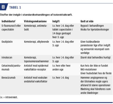 22% [1] af alle kolorektalkræftpatienter har metastatisk stadium 4-sygdom ved diagnosen. Et tilsvarende antal får fjernmetastaser oftest inden for to år fra operationen for primærtumoren. Igen er MDT-konferencen essentiel til afklaring af alle relevante muligheder. Når alle kurative muligheder er udtømte, er den væsentligste modalitet medicinsk kræftbehandling. Standardbehandlingen i Danmark [14] er at give kombinationskemoterapi med irinotecan og 5-FU hver 14. dag, hvor sidstnævnte gives over to dage som hjemmekemoterapi (Tabel 1).