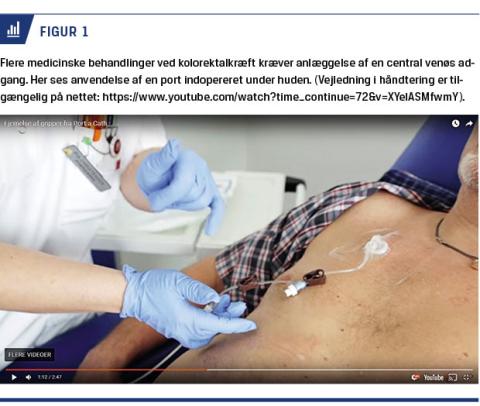 I 40% af tilfældene viser en supplerende mutationsanalyse (RAS/RAF) af tumorcellerne, at tillæg af et antistof, cetuximab eller panitumumab, kan have ekstra effekt [14]. Det gives sammen med kemoterapien hver anden uge. Hjemmekemoterapi forudsætter en central venøs adgang (Figur 1), og valg af antistof forudsætter en mutationsanalyse – begge dele kan være en tidsmæssig udfordring at få gennemført i tiden fra diagnose til behandlingsstart. Typisk fortsætter behandlingen, indtil der ved CT påvises vækst af kræften, dvs. resistens mod kemoterapien, men mange vil vælge at stoppe efter seks måneder. Når der sker udvikling i kræften, er næste behandlingsmulighed kemoterapi med oxaliplatin og 5-FU tillagt antistoffet bevacizumab [14]. Dette regime gives også hver 14. dag over to dage.