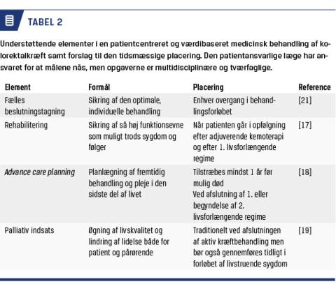 Holdningen til medicinsk behandling af kolorektalkræft er under stadig udvikling. Engang var målet at bevirke svind af kræften, så blev formålet øget og forlænget overlevelse, og nu står vi over for et skifte til værdibaseret behandling [20]; patienternes værdier vel at mærke (Tabel 2). En måde at opnå dette på er ved fælles beslutningstagning. Det indebærer en metode til patientcentreret kommunikation, hvor lægen ikke bare tager sygdommens status, komorbiditet og den kliniske tilstand i betragtning, men også patientens ønsker og værdier. Det skal føre til de relevante behandlingsforslag, der bedst inddrager alle disse aspekter. Patienterne inddrages i et delt ansvar for det endelige valg [21].