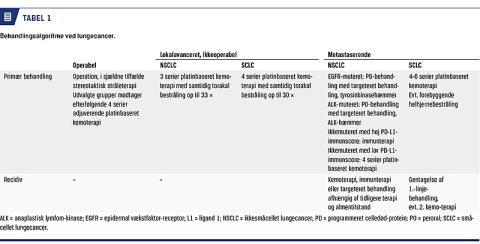 NSCLC opfattes i dag som en heterogen tumorform, der med hensyn til mikroskopisk udseende og klinisk forløb udviser stor variation. Der skelnes mellem planocellulær og ikkeplanocellulær lungecancer [6]. Sidstnævnte udgøres især af adenokarcinom og storcellet karcinom. En mindre andel (ca. 5%) af NSCLC udviser ikke særlige karakteriska ved lysmikroksopi eller immunhistokemi og benævnes derfor uspecificeret NSCLC. Et mindretal af NSCLC, primært blandt adenokarcinomerne, er karakteriseret ved specifikke mutationer i EGFR (8%) eller translokationer i ALK-EML4 (2%), som er styrende for sygdommens udvikling, og hvortil der er udviklet specifik hæmmende (targeteret) behandling [7-10]. Selv om en targeteret behandling ikke kan helbrede lungecancer, giver behandlingerne markant længere sygdomskontrol med færre bivirkninger end kemoterapi. Andre mutationer (BRAF, ROS1 og MET) er påvist hos meget få patienter med NSCLC, og selv om respons på targeteret behandling er beskrevet for disse patienter, savnes der fortsat solide data. For den store gruppe af patienter, hvor disse genetiske forandringer ikke kan påvises, er kemoterapi eller immunterapi den bedste behandling.