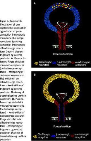 Blæremusklen (m. detrusor vesicae urinariae) indeholder talrige muskarinreceptorer og parasympatiske nerver med acetylkolin som perifer neurotransmitter. Blærehalsen, prostata og urethras glatte muskulatur indeholder talrige alfa-adrenerge nerver fra den sympatiske innervation (Figur 1 ). Derfor har behandling med alfaadrenergt blokerende medikamina effekt på obstruktive symptomer og besværet vandladning. Omkring 50% af det intrauretrale tryk opretholdes af alfaadrenergt stimuleret glat muskulatur. Effekten af alfaadrenergt blokerende farmaka er således stor.