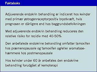 Adjuverende endokrin behandling anbefales til alle patienter med primær receptorpositiv brystkræft, hos hvem systemisk adjuverende behandling er indiceret [4]. Hos patienter under 60 år anbefales i dag endvidere kemoterapi. På basis af resultatet af randomiserede forsøg bliver de to behandlingsmodaliteter givet sekventielt, det vil sige kemoterapi efterfulgt af endokrin terapi. Anbefalinger er herefter: 1) Hos præmenopausale kvinder: kemoterapi efterfulgt af tamoxifen givet i fem år. Såfremt patienten ikke ønsker kemoterapi, kan der anbefales ovarial ablation/suppression eller tamoxifen. 2) Hos postmenopausale kvinder under 60 år: kemoterapi efterfulgt af endokrin behandling med tamoxifen og eller aromatasehæmmer. Den nuværende anbefaling er sekventiel behandling med tamoxifen i toethalvt år efterfulgt af behandling med aromatasehæmmer (anastrozol eller exemestan) i toethalvt år. Hos patienter, som har fået tamoxifen i fem år tilbydes efterfølgende behandling med aromatasehæmmer (letrozol) i mindst toethalvt år. Hvis der er relativ kontraindikation for behandling med aromatasehæmmer (kendt hyperkolesterolemi, arteriosklerotisk hjertesygdom eller symptomatisk osteoporose) anbefales fem års tamoxifenbehandling. Hvis der er relativ kontraindikation for tamoxifen (tidligere tromboemboliske episoder) anbefales fem års behandling med aromatasehæmmer (letrozol eller anastrozol). 3) Hos postmenopausale kvinder på 60 år og ældre: endokrin behandling alene, givet som til postmenopausale kvinder under 60 år.
