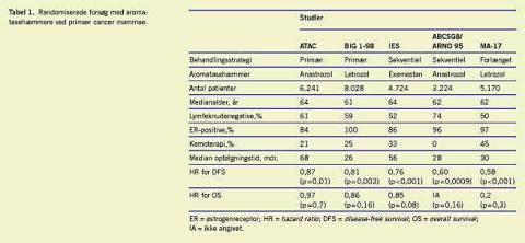 Fra disse studier er der publiceret data, som er resumeret i Tabel 1 [6, 7]. Som det fremgår, er studierne publiceret med varierende opfølgningstid, studiepopulationerne har ikke identiske karakteristika, og definitionen af endemål er ikke ens i de forskellige studier. Endvidere må det fremhæves, at patienterne, som er indgået i de sekventielle og i det forlængede studie, i forhold til patienterne i studier med primær behandling, er selekteret ved på tidspunktet for indgang i studiet at være recidivfri efter forudgående henholdsvis 2-3 års og fem års behandling med tamoxifen.