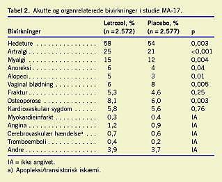 Bivirkninger ved behandling med aromatasehæmmere kan tilskrives den udtalte suppression af cirkulerende østrogen. I modsætning til ovarial ablation/suppression og tamoxifen er bivirkningerne med aromatasehæmmere specifikt vurderet i prospektive undersøgelser o ver for kontrol og over for tamoxifen [8]. Som det fremgår af Tabel 2 forekommer visse bivirkninger signifikant hyppigere ved behandling med letrozol end ved behandling med placebo (hedeture, atralgier, myalgier, anoreksi, alopeci og osteoporose), mens vaginal blødning, som kan tilskrives ophør med den forudgående tamoxifenbehandling, forekommer hyppigere i placebogruppen. I alle tilfælde er de numeriske forskelle i hyppigheden af bivirkninger dog små [6]. I sammenligningerne mellem aromatasehæmmere og tamoxifen er der set et karakteristisk mønster for alle tre tredjegenerationsaromatasehæmmere. Hedeture forekom med samme eller lidt lavere hyppighed ved behandling med aromatasehæmmere end ved behandling med tamoxifen; atralgier og myalgier forekom med større hyppighed og endometriecancer og tromboemboliske tilfælde forekom med lavere hyppighed. Kardiale hændelser og hyperkolesterolemi sås noget hyppigere i den aromatasehæmmerbehandlede gruppe end i gruppen, der blev behandlet med tamoxifen, hvilket dog kan forklares ved en kardioprotektiv og kolesterolsænkende effekt af tamoxifen [8]. I overensstemmelse hermed fandtes i MA-17-studiet identisk risiko for kardiovaskulær sygdom og hyperkolesterolemi i de to grupper, der var blevet behandlet med henholdsvis placebo og letrozol [10]. I samtlige studier er der set en tendens til øget risiko for frakturer/osteoporose i den gruppe, der blev behandlet med aromatasehæmmere. Behandling af de generelle symptomer, der er relateret til østrogendepletering er som beskrevet i afsnittet om ovarial ablation. Hvad angår knoglemetabolismen tilrådes generel osteoporoseprofylakse. Det er endvidere nu besluttet, at patienter i aromatasehæmmerbehandling med en knoglemineraltæthed (BMD) T-score på under -2,5 kan få individuelt tilskud til behandling med bisfosfonat. Visse steder i udlandet anbefales rutinemæssigt BMD-monitorering af alle patienter, der er i behandling med aromatasehæmmere. Herhjemme er en arbejdsgruppe under Dansk Knoglemineralsk Selskab og DBCG netop gået i gang med at udarbejde nationale retningslinjer.