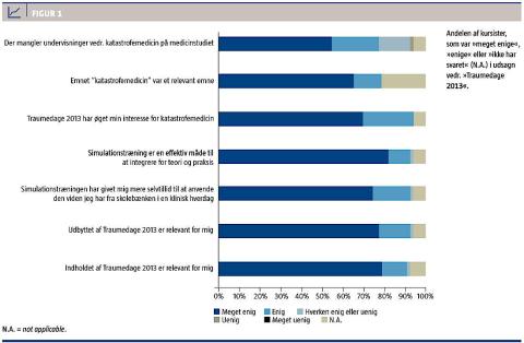 I alt 39% (26/66, 5 n.a.) var »meget enige« eller »enige« i, at de før Traumedage 2013 havde en relevant viden, og 89% (59/66, 4 n.a.) var »meget enige« eller »enige« i, at de efter Traumedage 2013 havde fået øget deres viden om katastrofemedicin. I alt 65% (43/66, 5 n.a.) fandt undervisningen i emnet katastrofemedicin »meget relevant« eller »relevant«, og 56% (37/66, 4 n.a.) var »meget enige« eller »enige« i, at det var ekstra udfordrende, at det sidste scenarie kom som en overraskelse.