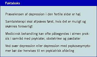 Medicinsk antidepressiv behandling bør foregå i tæt samarbejde mellem egen læge, psykiater, obstetriker og pædiater, og dette samarbejde skal indledes, så snart behandlingen iværksættes.
