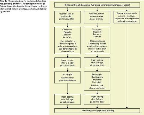 Medicinsk behandling af depression under graviditeten og i ammeperioden er ofte vanskelig og kræver en betydelig og opdateret viden om psykofarmakologi. Medicinsk behandling kan indledes, når andre behandlingsmuligheder, f.eks. kognitiv terapi, er udtømte, eller når depressionen er så svær, at det skønnes uforsvarligt at undlade antidepressiv behandling. Figur 1 viser en algoritme, som kan anvendes af læger uden specialistviden, når medicinsk behandling af depression hos gravide og ammende skal iværksættes. En mere detaljeret vejledning som er rettet mod specialister kan hentes på: www.regionsyddanmark.dk/wm211008.