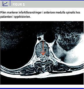 En 42-årig mand med polycystisk nyresygdom og medicinsk behandlet hypertension fik divertikulitis og undergik partiel kolektomi i generel anæstesi. Operationen forløb ukompliceret. Postoperativt blev der anlagt epiduralkateter på Th 10-niveau mhp. smertelindring. Der blev injiceret bupivacain/morfin 4 ml/t. I løbet af operationsdagen fik patienten vedvarende hypotension med middelarterieblodtryk (MAP) på 55-60 mmHg, som blev tilskrevet den epidurale anæstesi og behandlet med vasopressorer, indtil MAP var over 60 mmHg. Epiduralkateteret blev derfor seponeret på den første postoperative dag. På dette tidspunkt oplyste patienten, at han ikke havde kunnet bevæge begge underekstremiteter (UE) postoperativt, men han tilskrev det epiduralkateteret og havde derfor ikke nævnt det tidligere. Ved en neurologisk undersøgelse på den anden postoperative dag fandt man normale forhold på begge overekstremiteter. På truncus fandtes nedsat sensibilitet ved Th10 og ophævet temperaturfølsomhed kaudalt herfor. På UE fandt man varierende kraftnedsættelse i alle led, nedsat sensibilitet, ophævet evne til at skelne mellem spidst og stumpt, ophævet varme/kuldediskrimination og nedsat, men bevaret stillingssans. Man stillede derfor den kliniske diagnose medulla spinalis anterior-syndrom (MSA). På den baggrund havde man mistanke om spinalt infarkt, transversal myelitis eller strukturel skade. Patienten blev overført til Rigshospitalet, og der blev foretaget inkonklusiv magnetisk resonans (MR)-skanning, hvorved formodningen om fokale forandringer blev afkræftet. Trods bedring resterede der en betydelig paraparese efter tre døgn, hvorfor patienten blev indstillet til rehabilitering. Forinden blev der foretaget en ny MR-skanning, hvorved der blev verificeret MSA (Figur 1 ). Seks måneder postoperativt sad patienten fortsat i kørestol.