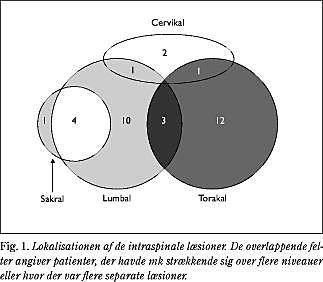 Lokalisationen af medullakompression fremgår af Fig. 1 . Hos ni patienter var flere regioner involveret, og seks havde flere separate intraspinale læsioner.
