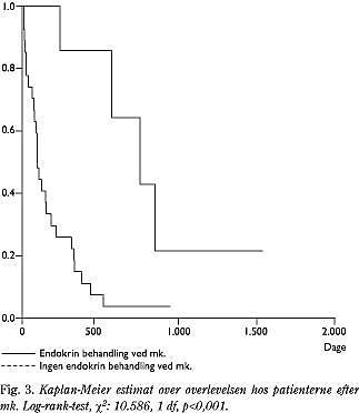 Overlevelsen efter behandlingen fremgår af Fig. 3 . Ved opgørelsen var fire patienter fortsat i live efter en observationstid på mellem 283 og 1.540 dage. Der var ikke statistisk signifikant forskel på overlevelsen for patienter, som havde fået endokrinbehandling i mere eller mindre end to år, var over eller under 70 år, havde medullakompression eller dura/ rodtryk eller havde læsion på en eller flere regioner (p>0,10 i alle tilfælde).
