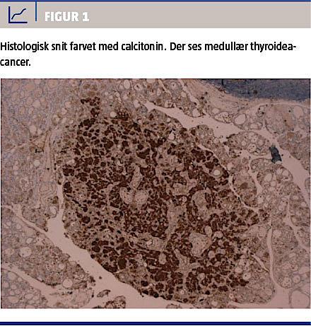 En ti måneder gammel pige var født præmatur med en gestationsalder på 33 + 5 og en fødselsvægt på 2.355 g. Hun havde spiseproblemer og var i dårlig trivsel og fik derfor sondetilskud og laksantia indtil femmånedersalderen. Mater havde M918T-germline-mutation i RET-protoonkogenet. En genetisk undersøgelse af barnet kort tid efter fødslen viste, at denne mutation var nedarvet til pigen. Der blev foretaget måling af S-calcitoninniveauet og UL-skanning af halsen. Da hun var fire måneder gammel sås en 1,2 mm stor central hypoekkogen forandring i glandula thyroidea, og hun blev henvist til profylaktisk tyroidektomi. S-calcotininniveauet var inden for normalområdet på 13 pmol/l og havde været stationært siden tomånedersalderen.