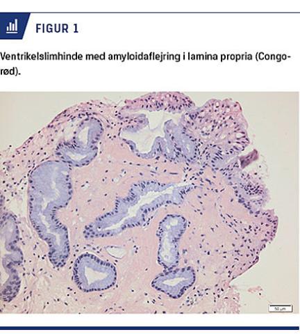 En 79-årig kvinde blev indlagt med melæna og alimentære opkastninger. Hun klagede over træthed og venstresidige mavesmerter. Der var intet vægttab eller disposition til malign sygdom. Hun havde hypertension, artrose, dialysekævende nefropati af ukendt genese og anæmi. Objektivt var hun kronisk påvirket. Abdomen var diffust ømt uden peritonealia og ved rektaleksploration fandt man melæna. Hæmoglobinniveauet var 5,5 mmol/l, og hun var cirkulatorisk stabil. Ved gastroskopi fandt man en malignitetssuspekt tumor i ventriklen og suspekte forandringer i duodenum. I disse områder var der let overfladisk blødning, der blev behandlet med injektion af adrenalinsaltvand og kontaktkoagulation. Tumoren blev biopteret. Patologisvaret viste amyloidaflejringer i duodenum og mulig amyloidtumor i ventriklen (Figur 1). Fire uger senere døde patienten af hjertestop. Obduktionen viste lymfoplasmocytoidt lymfom (mb. Waldenström) og diffuse amyloidaflejringer i tunge, ventrikel, duodenum, pancreas, binyrer, colon, rectum og hjerte. Der påvistes ikke nodulær amyloid-tumor. Endvidere fandt man hypertensiv nefropati.