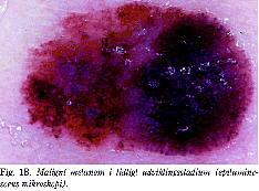 Klinisk undersøgelse i stærkt direkte lys og med anvendelse af forstørrelsesglas vil i et tidlig udviklingsstadium kunne afsløre pigmenterede, asymmetriske hudtumorer, hvor forskellige farver som sort, brunsort, blå eller lyserød ofte optræder samtidigt og ofte er ujævnt fordelte. Grænsen mod den omgivende hud er uskarp, og hudoverfladens fine mønster er gået tabt (Fig. 1A ). Ved anvendelse af epiluminescenshudmikroskopi vil de karakteristiske træk, der kendetegner malignt melanom, kunne iagttages (Fig. 1B ).