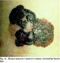 I mere avancerede udviklingsstadier af malignt melanom vil symptomer som kløe, blødning og hurtig vækst være de dominerende tegn. Klinisk undersøgelse af en tumor vil, ud over de under tidlig udvikling anførte fund, afsløre blandt andet sår og områder med arforandringer og småknudret overflade (Fig. 1C ). Disse tumorer vil som regel kræve en udvidet diagnostisk udredning.