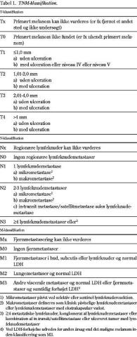Stadieinddeling foretages ved anvendelse af TNM-klassifikation, som omfatter vurdering af primærtumoren (T), undersøgelse af regionære lymfeknuder, herunder sentinelle lymfeknuder (N) og undersøgelse for fjernmetastaser (M), (Tabel 1 ).