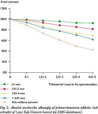Den femårige overlevelsessandsynlighed for patienter, der er behandlet for primærtumor uden påviselige metastaser, er ca. 80%, men med en stor variation afhængig af tumortykkelsen. For patienter med hhv. tynde (£0,75 mm) og tykke ( ³4 mm) melanomer er femårsoverlevelse således hhv. 97% og 47% (18) (Fig. 2 ). Når man ser bort fra tumortykkelse og vurderer prognosen for patienter med tumorer uden eller med ulceration, er femårsoverlevelsen hhv. 86% og 60% (18).