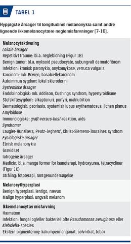Melanonykia er en tilstand, der er karakteriseret ved melaninpigment i neglen. Det ses typisk som en brun eller sort stribe gennem hele neglens længde fra neglematrix og distalt til neglens frie kant, såkaldt longitudinel melanonykia (LM). Figur 1A viser den normale negleenhedens anatomi. I den normale negleenhed findes der en væsentligt højere densitet af melanocytter i neglematrix end i neglelejet [1, 2]. Stimulering af melanocytter medfører en øget mængde melanin i neglematrix, og det inkorporeres i neglen i takt med, at denne vokser ud. Herved dannes et længdegående bånd af melanin i hele neglens længde. LM ses ved benign melanocythyperplasi i neglematrix (ungvalt nævus, lentigo), melanocytaktivering ved lokal eller generel hypermelanosis (infektioner, traumer, medicin) og ved malign proliferation (subungvalt melanom) [3]. Prævalensen for LM er hos kaukasider 1-2%, men det ses hyppigere hos personer med mørkere hudtyper [4, 5]. LM er ligeligt fordelt mellem kønnene [6] med en stigende prævalens med alderen [5]. Tabel 1 viser de mest almindelige årsager til LM og de hyppigste ikkemelanocytære misfarvninger, der kan ligne LM. Generelt set vil mørke misfarvninger, der er opstået i neglelejet eller distalt i neglen, ikke stamme fra melanin [7], selvom der findes beskrevne tilfælde [11]. Ikkemelanocytære misfarvninger kan dog fortsat give differentialdiagnostiske udfordringer i forhold til ungvalt melanom.