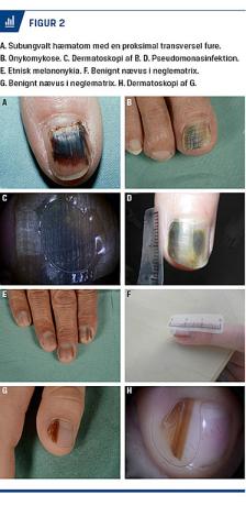 I nogle tilfælde kan der ses omkringliggende bloddråber i neglen. Ved dermoskopi kan man visualisere ovennævnte forandringer tydeligere (Figur 1H). Som neglen vokser, vil hæmatomet følge med distalt, og en ny, normal negl vil vokse frem. I nogle tilfælde ses en transversel fure i neglen proksimalt for hæmatomet som et udtryk for påvirkning af neglematrix i forbindelse med det udløsende traume [7] (Figur 2A). Blødninger kan som tidligere nævnt ses pga. en ulcererende tumor, hvilket bør indgå i de differentialdiagnostiske overvejelser. For at sikre, at misfarvningen vokser ud sammen med neglen, kan neglen ridses og patienten følges med klinisk kontrol. Ved tvivl om diagnosen bør der tages biopsi.