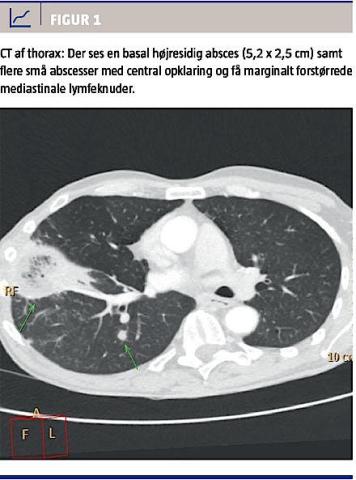 En røntgenundersøgelse af thorax afslørede et basalt højresidigt infiltrat. En transtorakal ekkokardiografi viste en sklerotisk aortaklap uden tegn til endokarditis. En CT af thorax viste en absces på 5,2 × 2,5 cm i nederste højre lungelap (Figur 1). Der fandtes leukocytose (14,0 (109/l)) samt forhøjet C-reaktivt protein (210,5 mg/l).