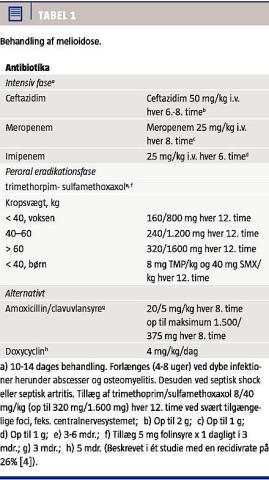 B. pseudomallei er en modstandsdygtig gramnegativ bakterie, som typisk findes i lerjord og overfladevand, såsom rismarker. B. thailandensis, som hos patienten i sygehistorien blev identificeret ved massespektrometri, er nært beslægtet med B. pseudomallei, men har et helt andet klinisk forløb, typisk mildt. B. pseudomallei kan erhverves ved inhalation, oral indtagelse eller efter inokulation og kan inficere svært tilgængelige foci, såsom centralnervesystemet, knogler og prostata. Mortalitetsraten er op mod 50% [3]. Person til person-smitte er yderst sjælden [4]. Inkubationstiden varierer fra 24 timer til flere år; gennemsnitligt ni dage [5]. Behandlingen opdeles i en intensiv fase og en eradikationsfase (Tabel 1) [4, 5]. Risikofaktorer, såsom diabetes mellitus, alkoholmisbrug og kronisk lungesygdom synes at have betydning [4].