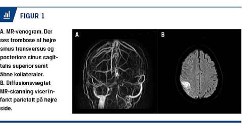 af empyemet, men dette kunne ikke påvises ved MR-skanning. Symptomerne blev tolket som meningeal irritation. Dagen efter indtrådte der igen forværring med generaliserede krampeanfald. En CT viste sløring af mellemøre og mastoid trods dræn. Der blev udført mastoidektomi. En MR-skanning med venogram viste trombose af højre sinus transversus og posteriore sinus sagittalis superior (Figur 1A) samt tegn på venøst infarkt på højre side (Figur 1B). Der blev påbegyndt antikoagulans (AK)-behandling. Ud over en p-stav, som blev fjernet, havde patienten ingen kendte trombogene risikofaktorer. Efter fire uger blev hun udskrevet til kortvarig rehabilitering pga. milde kognitive deficit.