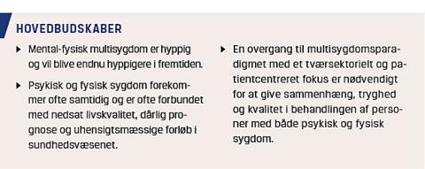 Mental-fysisk multisygdom forekommer hyppigt og komplicerer ofte patientbehandlingen. Der findes en stærk sammenhæng mellem psykisk og fysisk helbred, og mental-fysisk multisygdom har store konsekvenser for patienterne i form af nedsat funktionsniveau,