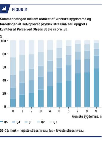 At leve med mental-fysisk multisygdom er ofte forbundet med nedsat funktionsniveau og dårlig livskvalitet, som forringes med et stigende antal sygdomme [10]. Patienter med psykisk lidelse lever i gennemsnit ti år kortere end baggrundsbefolkningen [11], og denne nedsatte forventede levetid er særlig kort for patienter med skizofreni og bipolar affektiv sindslidelse, idet de lever op til 15-20 år kortere end baggrundsbefolkningen [12]. Ulykker og selvmord er hyppige hos personer med psykiske lidelser, men de fleste tabte leveår skyldes underdiagnostik og underbehandling af somatiske lidelser [8, 13]. Det psykiske symptombillede kan overskygge fysiske symptomer, hvilket kan resultere i, at behandlingen af de somatiske sygdomme bliver iværksat for sent [14]. Patientrelaterede årsager til den dårligere behandling er legio, men kan bl.a. være, at personer med psykiske symptomer har sværere ved at opfylde de ret omfattende krav til komplians og egenomsorg, som optimal håndtering af flere samtidige kroniske sygdomme kræver [14, 15]. Ud over en belastning fra symptomer fra flere sygdomme (sygdomsbyrden) oplever patienter med multisygdom en betydelig belastning fra de krav, som sundhedsvæsenet stiller i forbindelse med behandling, såsom medicinindtagelse, koordinering af aftaler, adfærdsændringer samt forebyggelses-, behandlings- og rehabiliteringsforløb (behandlingsbyrden) [16]. Patientens evne til at imødegå og håndtere de helbredsmæssige udfordringer er omvendt proportional med det selvoplevede psykiske stressniveau [17], som generelt er højt for patienter med mental-fysisk multisygdom. På Figur 2 ses, hvordan andelen af personer med højt stressniveauet stiger med antallet af kroniske sygdomme i et udsnit af den danske befolkning [6].