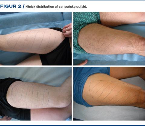 Klinisk vurdering er det altovervejende vigtigste redskab i diagnosticeringen. Der er ofte et skarpt afgrænset område med reduceret sensibilitet. Dette område er lokaliseret anterolateralt på låret med en proksimal grænse 5-10 cm under SIAS til 5-10 cm over knæniveau (Figur 2). Da nerven som nævnt udelukkende er sensorisk, vil der ikke være motoriske udfald. Tinels tegn er ofte til stede.