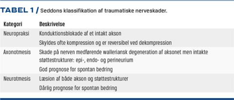 Meralgia paresthetica (MP) er en lidelse, der rammer ca. 30/100.000, ligeligt fordelt mellem kvinder og mænd [1]. Tilstanden er en mononeuropati af n. cutaneus femoralis lateralis (LFCN), der stammer fra de lumbale nerverødder L2 og L3 og har sit forløb lateralt for m. psoas major, gående over m. iliacus for derefter at løbe under l. inguinale gennem lacuna musculorum for at nå den anteriore del af låret medialt for m. sartorius. Her passerer den ud gennem fascia lata for at forgrene sig til den anterolaterale del af låret. Nerven er udelukkende sensorisk, og hvis den bliver udsat for kompression, giver det klassisk en brændende, stikkende fornemmelse, som er lokaliseret anterolateralt på låret. Med tiden tilkommer der desuden reduceret sensibilitet i det samme område. Patofysiologien bag MP er kompression af nerven, og derfor medfører MP lokal iskæmi i starten. Iskæmien fortager sig, når kompressionen forsvinder, og normal blodgennemstrømning i nerven er genoptaget (neuropraksi) (Tabel 1). Ved vedvarende kompression tilkommer der permanente forandringer (axonotmesis)i nerven, og generne bliver konstante.