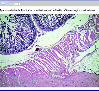 Patienten havde haft ganske lille afføringsændring i form af lidt mere fedtet afføring, men var i øvrigt uden gener. Der blev foretaget eksplorativ laparatomi, hvor man 140 cm fra Treitz ligament fandt en 1.262 g stor tumor, der sad fast til tyndtarmskrøset. En del af tyndtarmen var fuldstændig indlejret i tumor. På snitfladen sås tumorvævet let nodulært opbygget, men relativt ensartet og ensfarvet. Mikroskopisk sås en uskarpt afgrænset proces, der var opbygget af storiformt arrangerede tynde fibroblaster (Figur 1 ). Derudover sås brede strøg af keloidlignende kollagene strøg. Tumorcellerne infiltrerede op i tarmvæggen og således igennem tunica muscularis og ind i lamina propria samt ind i det omgivende krøs fedtvæv. Der var ingen perineuralvækst eller karinvasion. Ved immunhistokemisk farvning sås negativ reaktion for bredspektret keratin (AE1/AE3), melanom/neuromarkør (S100) og glatmuskelmarkører (actin, desmin) CD34 og GIST-markøren (CD117). Det drejede sig således morfologisk og immunhistokemisk om MF.