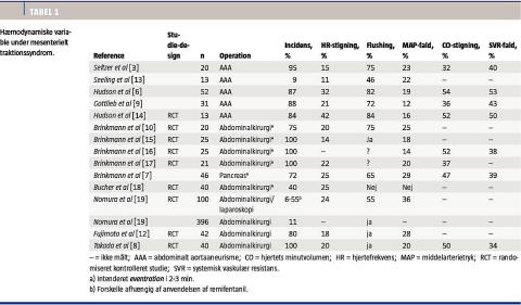 Brinkmann et al [7] provokerede MTS med en incidens på 72-100% under abdominal aortakirurgi og øvre gastrointestinale indgreb ved et 2-3 minutter varende træk på mesenteriet (Tabel 1), og andre har fundet en lignende forekomst (58-87%) [9, 14]. MTS forekommer hos 12% af patienter, der ikke udsættes for manipulation af mesenteriet, og hos 6% ved laparoskopi [19]. Anvendelse af remifentanil til smerte