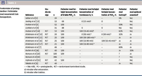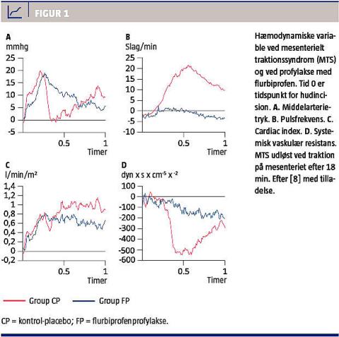 efter træk på mesenteriet og organer forsynet af a. mesenterica superior. Dette er i overensstemmelse med, at koncentrationen af P-6-keto-prostaglandin F1 (PGF1) (en stabil prostacyklinmetabolit) er øget ved MTS (Tabel 2) [9-18], og MTS ses ikke ved retroperitoneal adgang til aorta. Intravenøst administreret flurbiprofen (en uspecifik COX-hæmmer) virker profylaktisk mod udviklingen af MTS og har også effekt ved etableret MTS, således at blodtrykket normaliseres [12, 18]. Derimod har COX-2-antagonister ingen effekt på produktionen af prostacyklin ved provokeret eventration [11]. P-6-keto-PGF1-koncentrationen når et maksimum inden for 30 minutter efter visceral traktion og er fortsat forhøjet efter seks timer [14, 15].