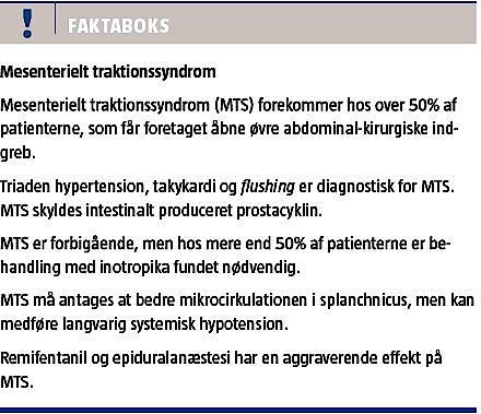 I forbindelse med større åben abdominalkirurgi er det nødvendigt at manipulere organer for at opnå overblik og udføre det operative indgreb. Denne manipulation medfører ofte eventration, dvs. at abdominalindholdet displaceres under træk på mesenteriet. Dette mesenterielle træk kan medføre synlige iskæmiske forandringer i form af stase og cyanose, og det kan udløse det såkaldte mesenterielt traktionssyndrom (MTS). MTS indbefatter triaden hypotension, takykardi og flushing [3]. MTS er kun sparsomt beskrevet [4], og her beskrives MTS (også kendt som eventration eller blush syndrome) og dets potentielle betydning for postoperative komplikationer efter øvre gastrointestinale indgreb. PubMed, Rex og Google Scholar er gennemgået med MESH og nøgleord: mesenteric traction syndrome, eventration syndrome, blush syndrome, mesenteric, mesentery, traction, syndrome, blush, prostacycline og eventration. Referencer i de fundne artikler er benyttet til yderligere søgning, ligesom lærebøger er fundet på Københavns Universitetsbibliotek med MTS som søgeord.