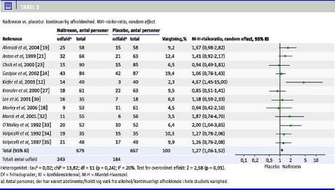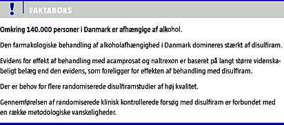 Summary Meta-analysis of pharmacological therapy with acomprosate, naltrexone, and disulfiram - a systematic review Ugeskr Læger 2011;173(48):3103-3109 The meta-analysis is based on 16 randomized controlled trials of acamprosate, 18 of naltrexone and 7 of disulfiram. Acamprosate and naltrexone were 52% (RR = 1.52; 95% confidence interval (CI): 1.35-1,72) and 27% (RR = 1.27; 95% CI: 1,06-1,52) better than placebo when it came to supporting continuous abstinence. Acamprosate increased the total number of abstinence days with 14% (MD = 14.02; 95% CI: 9.57-18.47). Disulfiram appeared to be effective only when the intake was supervised. Based on the amount of scientific evidence, acamprosate and naltrexone therapy should be increased in clinical practice in the treatment of alcoholism.