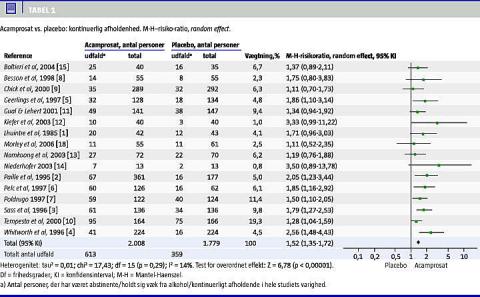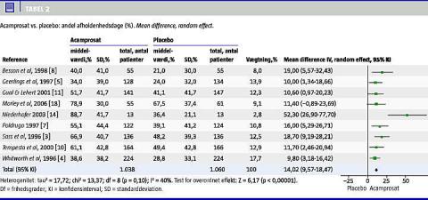 I 15 acamprosatstudier undersøgte man for antal afholdenhedsdage. I seks af disse har man ikke publiceret tilstrækkelige data om effektmålet, og de blev derfor ikke inkluderet i analysen (Tabel 2 ). Studiernes population varierede fra 26 til 448, behandlingsperioden varierede fra 12 uger til 12 måneder, og den typiske acamprosatdosis var på 1.332 mg/dag eller 1.998 mg/dag afhængigt af kropsvægten.