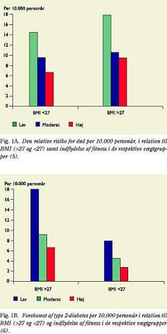 Haapanen-Niemi et al (4) har sammenfattet litteraturen omkring forskellige risikofaktorers relative betydning i relation til præmatur død (Tabel 1). Billedet er tydeligt: at være fysisk inaktiv indebærer en risiko, der er lige så stor som ved rygning og helt på niveau med høje blodfedtværdier og hypertension. Det er bemærkelsesværdigt, at overvægt udgør en væsentligt lavere risiko. I et samfundsmæssigt perspektiv er population attributable risk (PAR [relativ risiko ganget med frekvens i befolkningen]) den interessante variabel. I og med at forekomsten af fysisk inaktivitet stiger i mange lande, så stiger PAR for fysisk inaktivitet også og bliver den vigtigste livsstilsrisikofaktor. I Danmark i dag, hvor der fortsat er mange rygere, udgør inaktivitet og rygning samme store PAR (personlig meddelelse), mens overvægt ligger i den lave ende af skalaen. Af speciel interesse er de epidemiologiske undersøgelser, hvor betydningen af fysisk aktivitet vurderes i relation til BMI. Disse studier viser et ensartet mønster uanset om effektmålet er sygdom eller dødelighed som følge af hjerte-kar-sygdomme og type 2-diabetes. Selv ved en markant overvægt (BMI >27) kan fysisk aktivitet kompensere for udviklingen af type 2-diabetes (Fig. 1) (6). Et fund som bekræftes af studier, der er foretaget på mænd med overvægt og glukoseintolerance (7). Ikke mindst resultater fra sidstnævnte studier taler for, at skeletmuskulaturens metaboliske kapacitet har en selvstændig betydning.