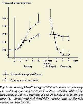 Efter nogle uger med øget aktivitetsgrad blev der observeret nogle vigtige forskelle mellem udviklingen af kondition på den ene side og af den mitokondrielle kapacitet på den anden. I løbet af de første uger forøges begge variable ensartet. Derefter fortsætter mitokondriernes enzymaktivitet med at stige, mens stigningen i kondition aftager (Fig. 2) (8). Efter 4-6 uger er konditionstallet forøget med 15-20%, mens den mitokondrielle enzymaktivitet er forøget med det dobbelte eller mere. Potentialet for aerob metabolisme i muskelfibrene forøges således markant o g mere end »nødvendigt« for den maksimale iltoptagelse. Dette ses endnu tydeligere, når utrænede sammenlignes med meget veltrænede personer. Forskellen i konditionstal kan være 50-60%, mens mitokondrietætheden og enzymaktiviteten adskiller sig med en faktor 4 (3). Det betyder, at skeletmuskulaturen besidder en metabolisk overkapacitet, hvis størrelse påvirkes af træning. Hvis betegnelsen metabolisk fitness skal defineres, kunne det være ratioen mellem den mitokondrielle kapacitet til substratomsætning og musklens maksimale iltoptagelse. Mere præcist omfatter det en summering af den maksimale kapacitet til at danne acetyl-CoA fra pyruvat og fedtsyrer divideret med den maksimale fluksionshastighed for α-ketogluterat, som i mange dyrearters (også menneskets) muskler synes at være bestemmende for musklens maksimale iltoptagelse (9).