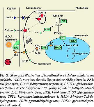 Hvorfor er der en forskel mellem aerob og metabolisk fitness, og har den en funktionel betydning? Et entydigt svar findes ikke. Et stigende antal resultater understøtter dog den antagelse, at den metaboliske overkapacitet muliggør en stor fedtudnyttelse i skeletmuskulaturen både i hvile og under arbejde (10). Til dette synspunkt bidrager resultater fra nyere studier, som viser, at det ikke kun er den mitokondrielle kapacitet, der forbedres med træning, men også substrattransportproteiner (Fig. 3). Endvidere øges lipoproteinlipasen (LPL), hvilket muliggør et forøget forbrug af triglycerider (S-TG) fra blodet, når det passerer gennem musklernes kapillærnet (11). De fedttransporterende proteiner i sarkolemma og transporten af fedtsyrer ind i mitokondrierne forøges også (10). Med en større fedtoxidation bliver kulhydratforbruget reduceret, hvilket ses tydeligst under arbejde (12). Umiddelbart kunne man derfor formode, at der sker en nedregulering af det vigtigste glukosetransportprotein i musklen (GLUT4) og andre enzymer, der er involverede i glukosestofskiftet. Det er imidlertid ikke tilfældet. GLUT4 forøges med fysisk aktivitet både hos raske mennesker og hos type 2-diabetikere, ligesom det er tilfældet for hexokinase (HK), der fosforylerer glukose efter transport ind i muskelcellen, og for glykogensyntase (GS), der er kritisk for glykogensyntesen.