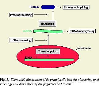 Resultaterne i Fig. 2 viser, at inden for en til to uger efter at en person har forøget eller formindsket sin fysiske aktivitetsgrad, ses der forandringer i mitokondriernes enzymaktivitet med en klar tendens til, at når aktivitetsniveauet reduceres, mistes den metaboliske træningsgevinst hurtigere end den bygges op (8). Konditionen forringes også, men det er bemærkelsesværdigt, hvor meget langsommere denne reduktion sker. Tidsrelationen mellem fysisk aktivitet og metabolisk fitness er således tættere og mere udtalt end mellem fysisk aktivitet og aerob fitness. Genekspression som følge af fysisk aktivitet er ovenfor beskrevet på proteinniveau. Disse forandringer er ikke altid store, og det kan tage op til flere uger inden en signifikant effekt kan påvises. På den baggrund åbnes der for nye muligheder med de molekylærbiologiske metoder som findes i dag til at studere genekspression på transskriptionsniveau i skeletmuskulaturen hos mennesker (Fig. 5) (26). Fysisk aktivitet nogle gange eller måske blot en enkelt gang har en effekt på visse geners aktivitet, hvilket kan måles i forbindelse med træning. Resultater viser også, at det er muskelkontraktionen og stofskiftet i musklen, som inducerer aktiveringen af generne. Her følger nogle eksempler: