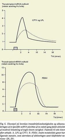 Når transskriptionshastigheden og akkumuleringen af mRNA bestemmes for LPL-genet ved cykling, ses det at transskriptionshastigheden øges (26) og - med en vis forsinkelse - også mRNA for LPL (Fig. 6A) (26, 27). I restitutionsfasen efter arbejde er genet fortsat aktiveret i nogle timer, hvorefter transskriptionshastigheden atter mindskes mod hvileniveau, mens den forøgede ekspression på mRNA-niveau opretholdes i endnu nogle timer, dog sjældent til næste dag. At proteinet bliver dannet og transporteret til sin lokalisation inde i kapillæren, er tidligere blevet påvist. Et andet kritisk enzym er 3-hydroxyacyl-CoA-dehydrogenase (HAD), som indgår i β-oxidationen af fedtsyrer i mitokondrierne. HAD og LPL har et ensartet mønster for forandringer på transskriptionsniveau, om end genet, der koder for HAD, kommer langsommere i gang. Til gengæld opretholdes mRNA-akkumuleringen længere.