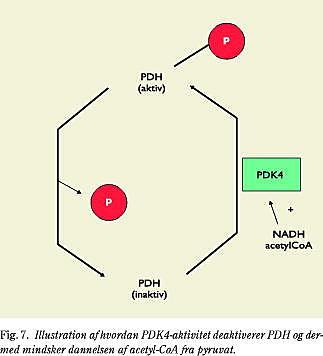 Transportproteinerne påvirkes også af en enkelt gang træning. Det gælder fx for CPT (Fig. 6A) (26) og GLUT4 (28). Forandringsmønsteret er det samme, men forandringen kommer hurtigere for CPT end for GLUT4. Også ekspression af gener, der koder for enzymer som HKII og GS påvirkes akut (26). Af speciel interesse er det, at også genet for enzymet pyruvatdehydrogenasekinase 4 (PDK4), der er involveret i reguleringen af mitokondriernes brug af pyruvat eller fedtsyrer, er meget følsomt for muskelkontraktioner (Fig. 6B) (26). Genet er nærmest inaktivt i hvile, men allerede efter en times moderat muskelarbejde er genekspressionen opreguleret. PDK deaktiverer pyruvatdehydrogenase (PDH) og inhiberer dermed decarboxyleringen af pyruvat og dannelsen af acetyl-CoA (Fig. 7). I de forsøg, som vi hidtil har gennemført, har vi fokuseret på PDK4-ekspression på transkriptions- og mRNA-niveau, men selv om vi således endnu ikke har etableret metoderne til bestemmelse af PDK4-protein og -aktivitet, ses effekten af den øgede PDK4-ekspression ved, at PDH-aktiviteten falder, og det samme gør kulhydratforbruget.
